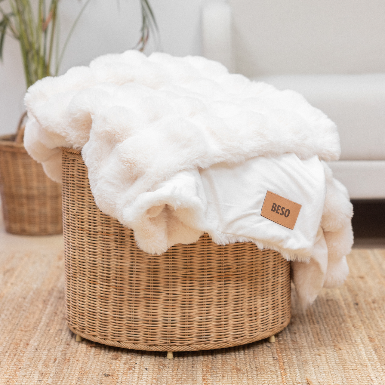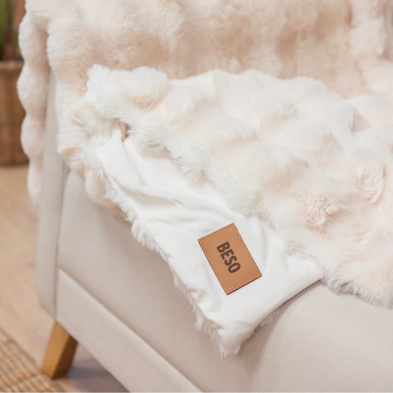 Comfortable blanket in beige, 100% polyester, sewn with double seams.